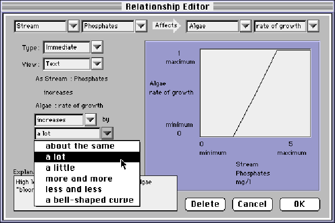 To build a model, a student begins by creating objects, and choosing photos or pictures to represent them. Next the student defines factors, measurable quantities or characteristics associated with each object. Then the student defines the relationships between factors, either qualitatively, (Figure 1) or quantitatively, by clicking on the points of the graph or inputting a table of values.